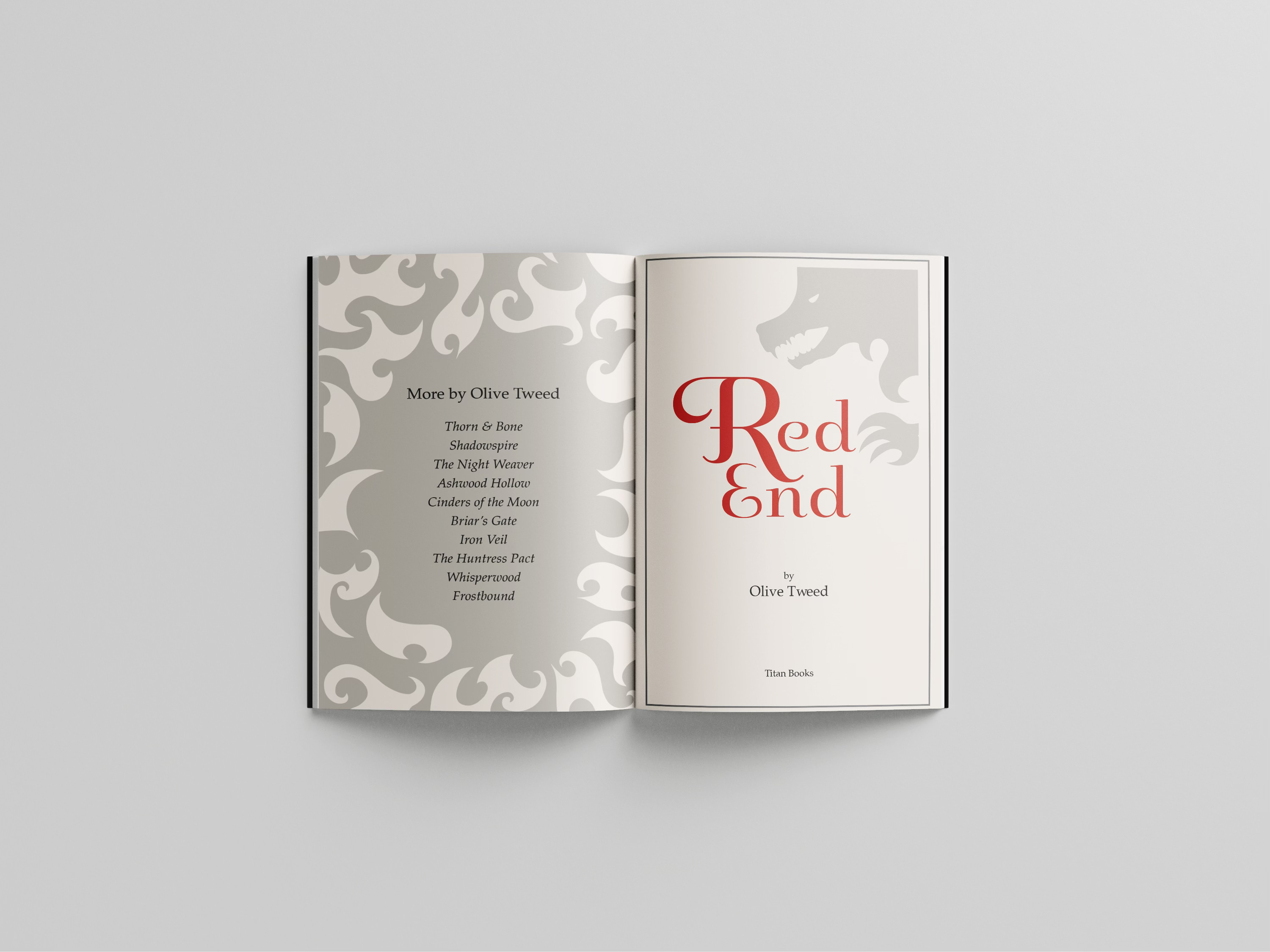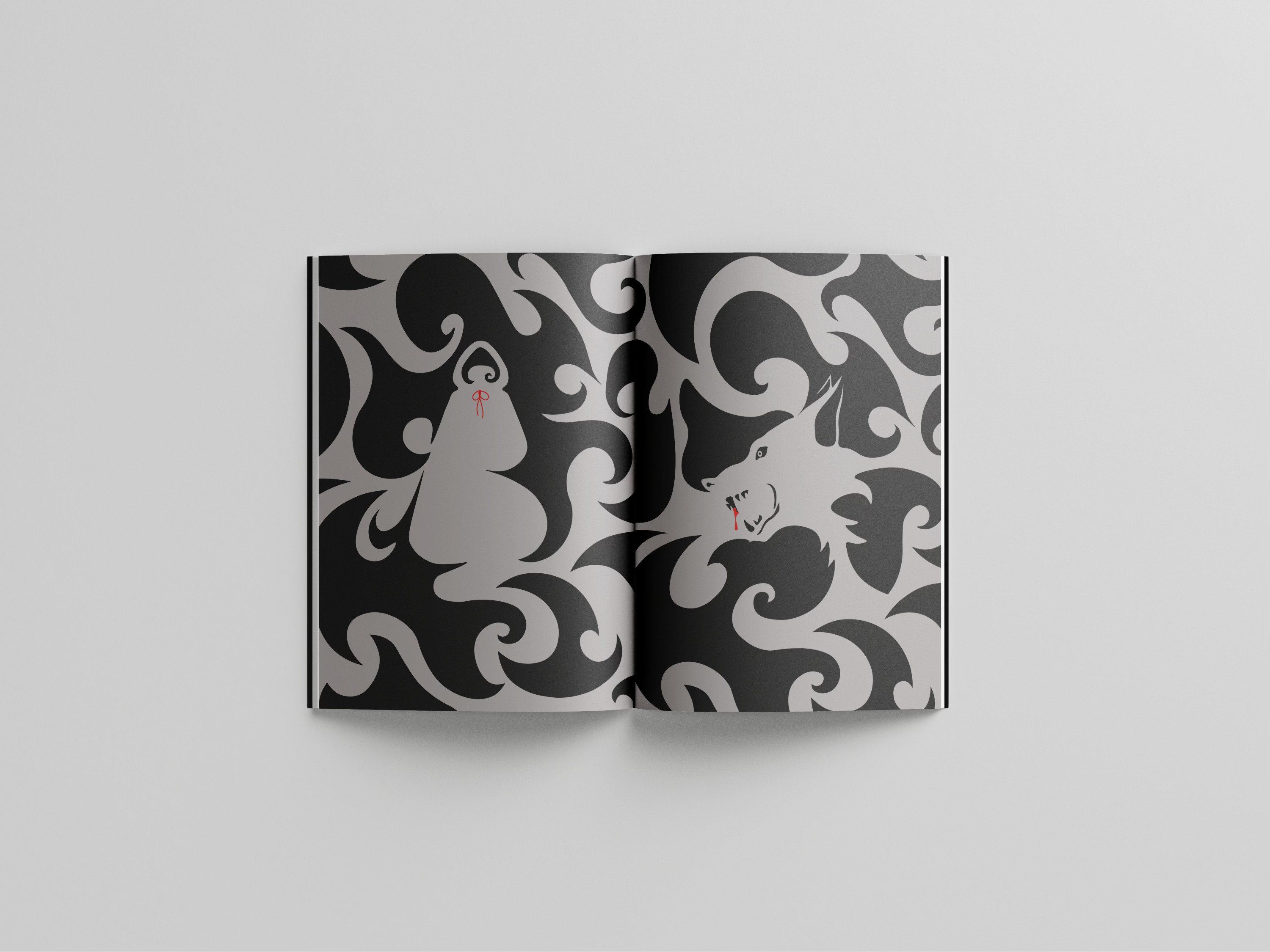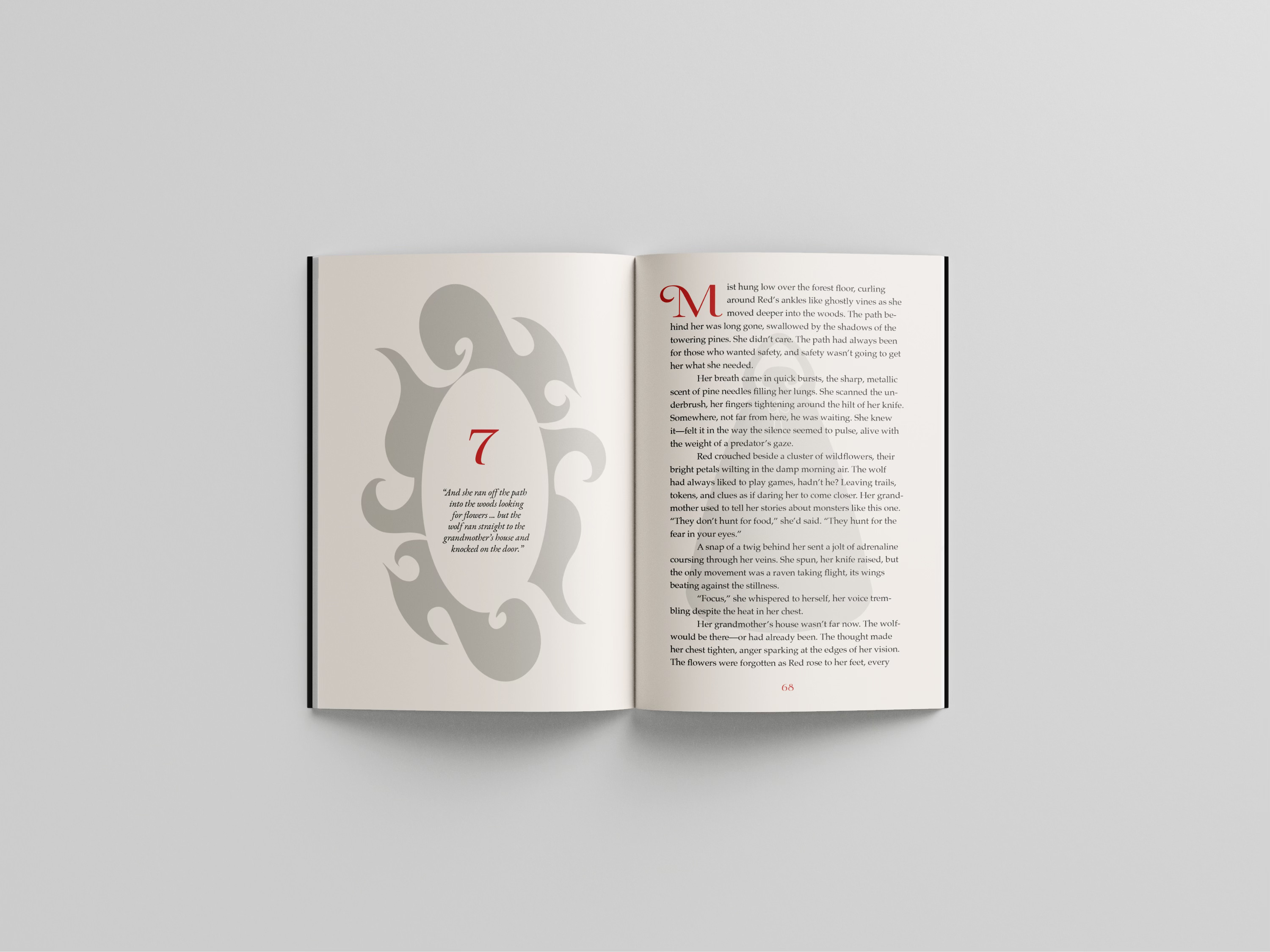 YA book concept reimagining the Red Riding Hood narrative. The project includes a cover and interior spreads using expressive typography and axe-blade-inspired forms. Awarded Gold in the Graphis New Talent Awards 2025.
